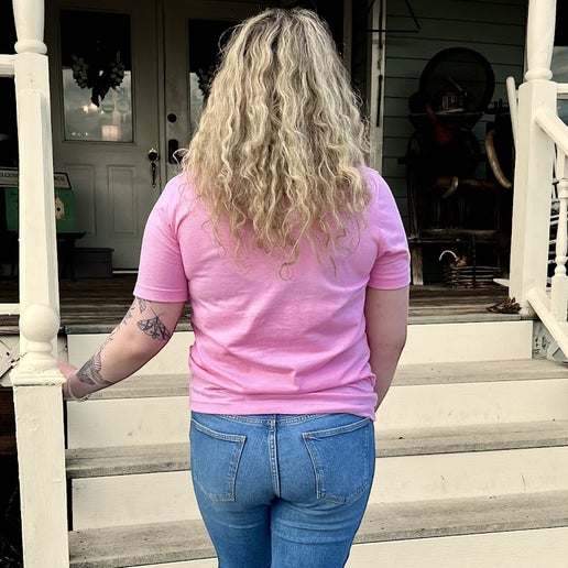 Don't break my heart! My achy breaky heart! Heather pink short sleeve unisex tee screen-printed with red water based ink for a soft vintage feel. We love to pair this with jeans and a cardigan.