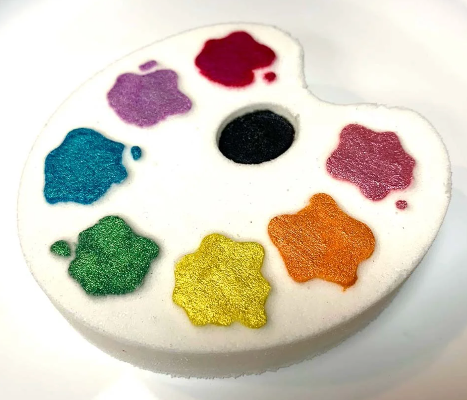 These fun color changing painters palette bath bombs are handmade and individually painted at Poppy & Thyme in Wisconsin! There is a secret rainbow inside that fizzes out into the bath and they are scented in a wonderful fruity scent. Each bath bomb is individually shrink-wrapped.