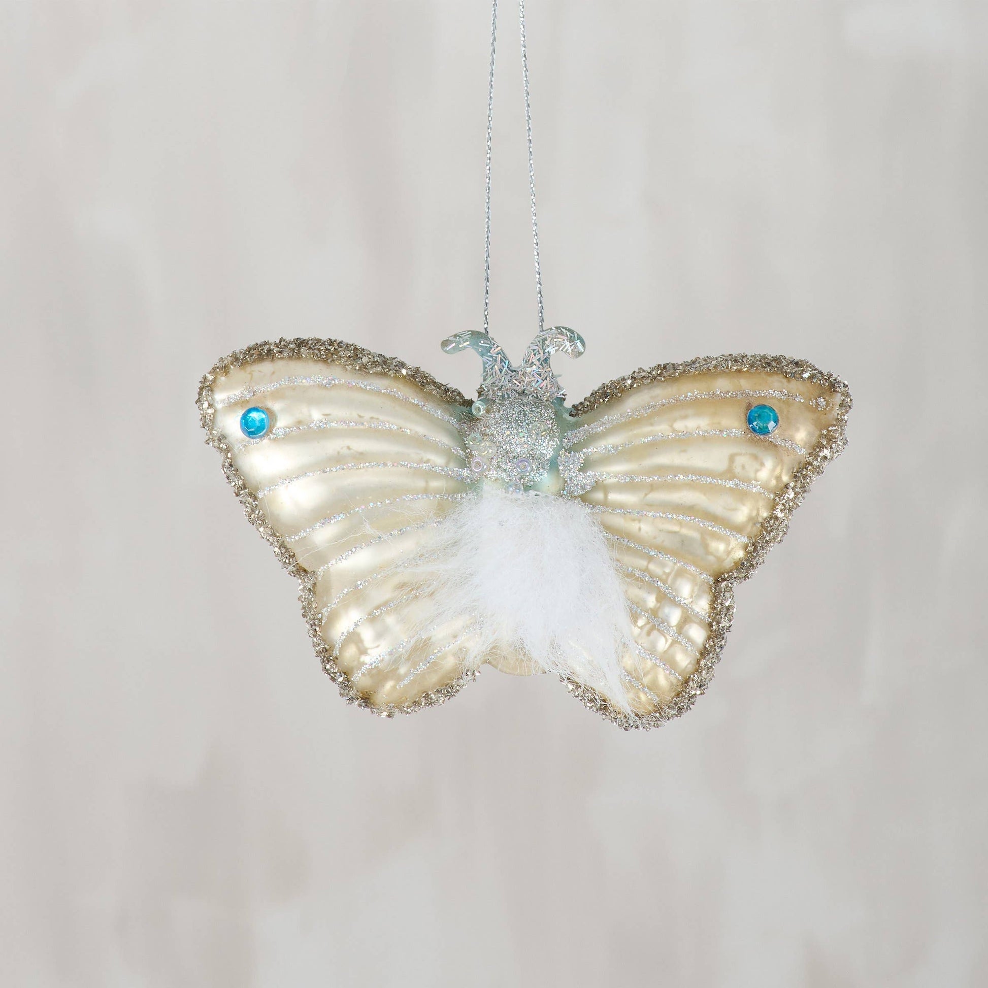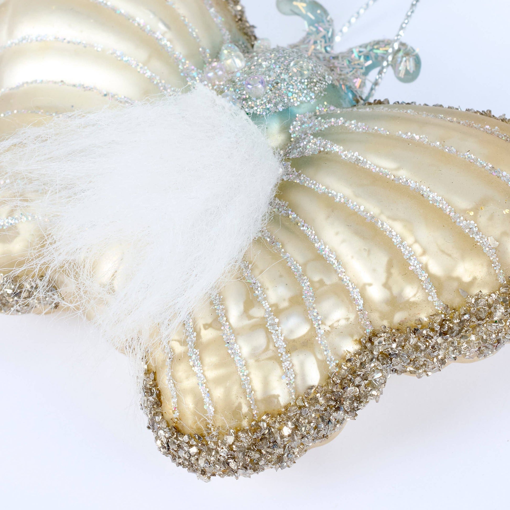 Celebrate nature's beauty with this charming glass moth ornament, complete with hand-painted details and playful embellishments of glitter, gems, and faux fur. Perfect for brightening your Christmas tree or displaying year-round as a quirky nature-lover's treasure.