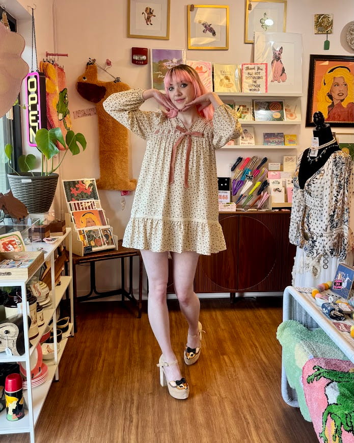 A cream floral mini dress finished with a velvet bow detail. Warm, grounded, and softly feminine. Has inner lining!