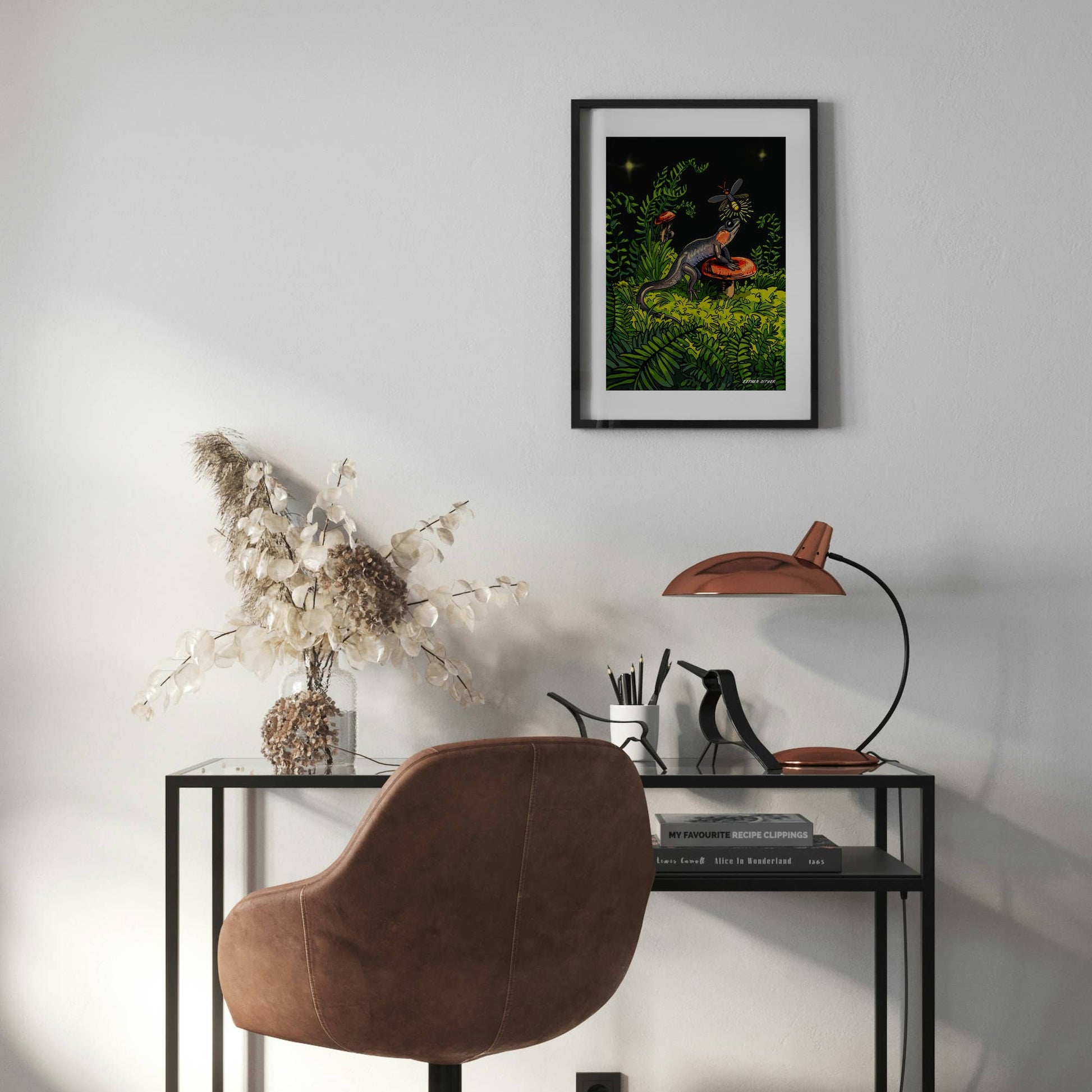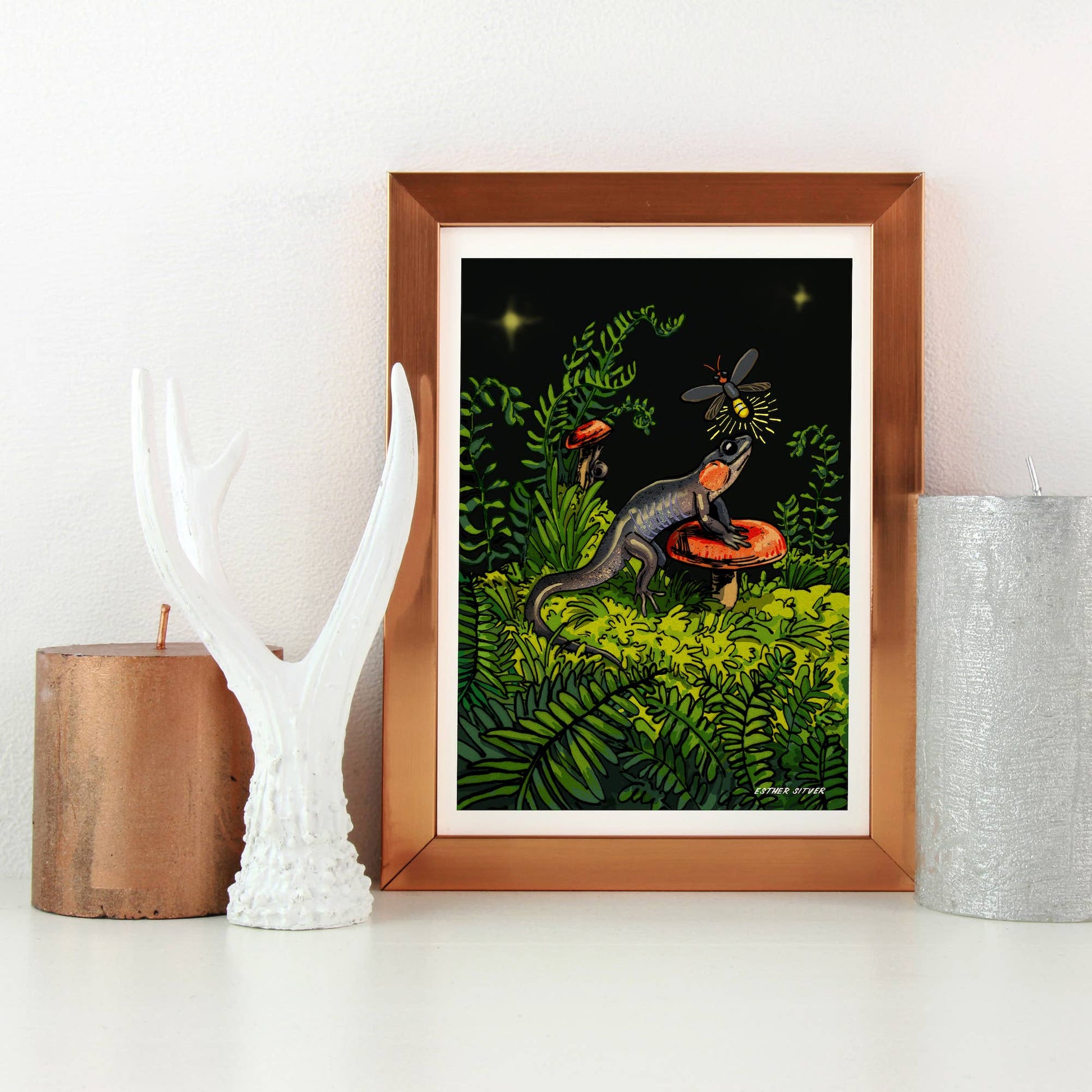 Do you love the mountains? Miss the fresh air and the salamanders? This print based off of Andrew's Bald is sure to bring the spirit of the Smoky Mountains into your home in no time. This print features an illustration of a red-cheeked salamander perched atop a mushroom to watch a glowing firefly. Bonus snail in the background if you can spy it! Made by Esther Sitver from Knoxville, TN!