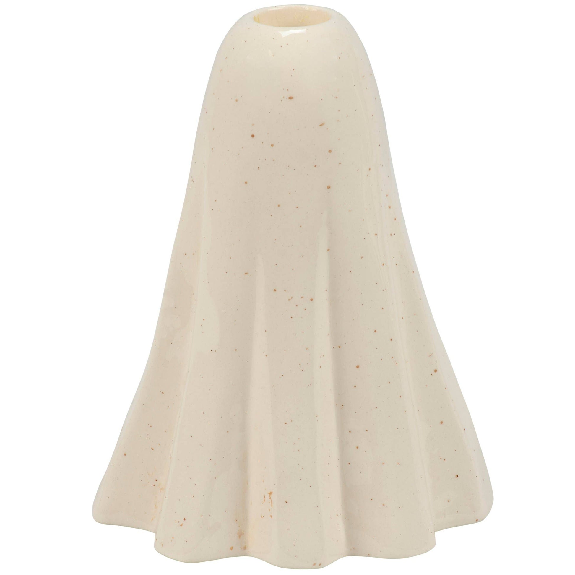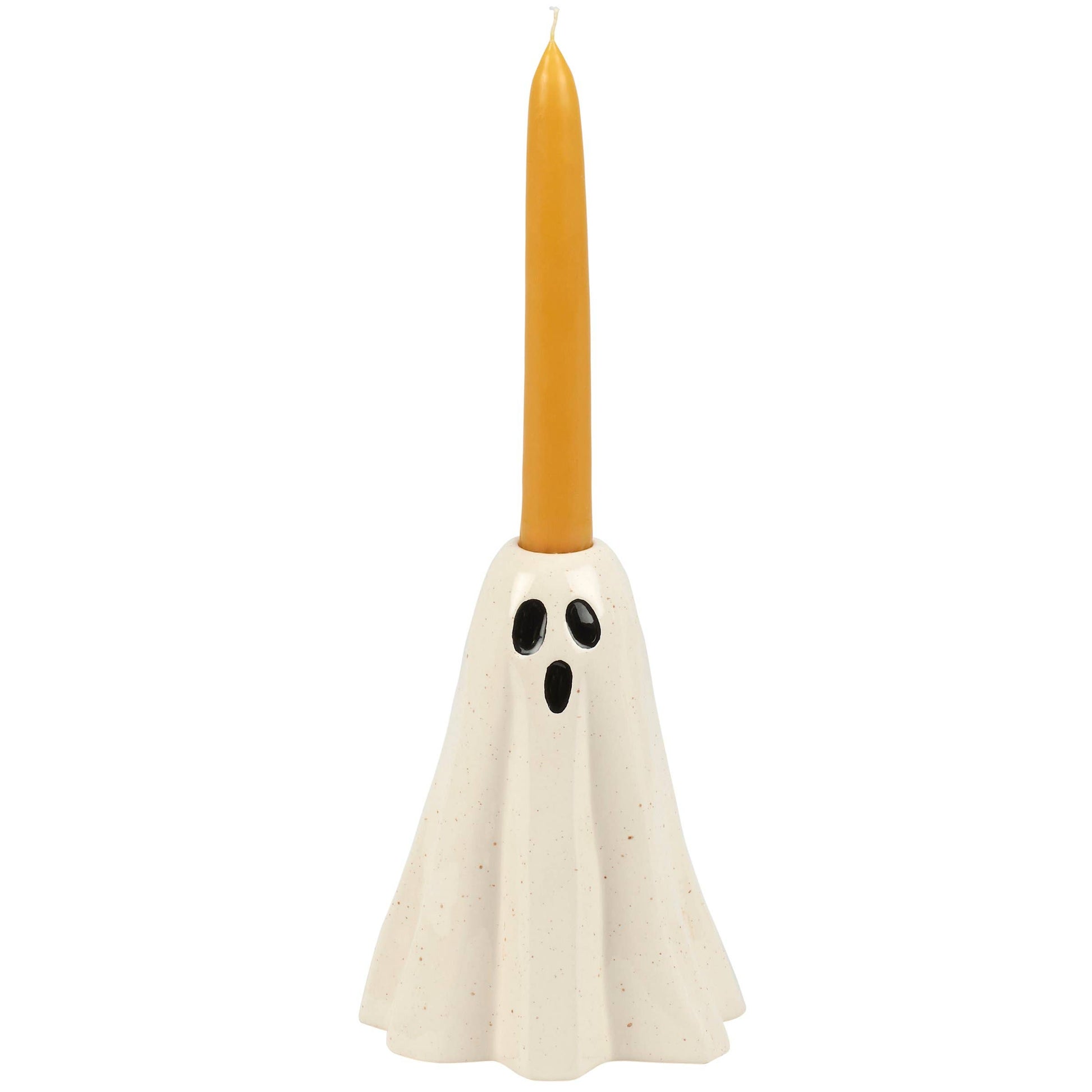 This spooky ceramic candle holder features a fun sculpted sheet ghost design with a painted boo face and a slot on top to place a single candle. The Scary Ghost candle holder fits standard taper candles and can free-stand on flat surface for display. Candle pictured not included.